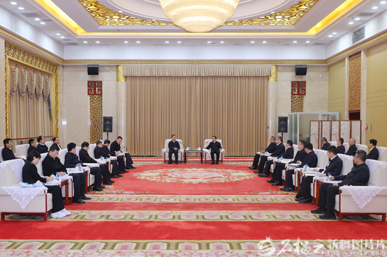 10月30日,自治区党委书记陈小江、自治区主席艾尔肯·吐尼亚孜在乌鲁木齐会见国家能源集团董事长邹磊一行。石榴云/新疆日报记者崔志坚摄