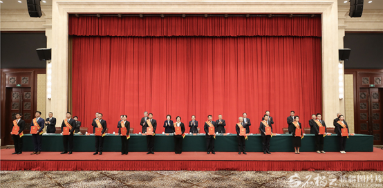 11月17日,自治区党委书记陈小江,自治区党委副书记、自治区主席艾尔肯·吐尼亚孜和有关院士、专家共同为干旱区生态安全与可持续发展全国重点实验室和新疆能源化工实验室、丝路水实验室、昆仑智能装备实验室、新疆天山科技创新院揭牌。石榴云/新疆日报记者崔志坚摄