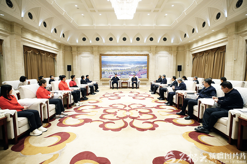 1月29日,自治区党委书记陈小江,自治区党委副书记、自治区主席艾尔肯·吐尼亚孜会见国家体育总局局长、党组书记高志丹一行。石榴云/新疆日报记者谢龙摄