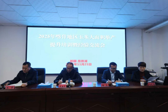 11月21日,2025年喀什地区玉米大面积单产提升培训暨经验交流会在岳普湖县召开。岳普湖县相关领导及全地区各县市农业部门负责人参加会议。