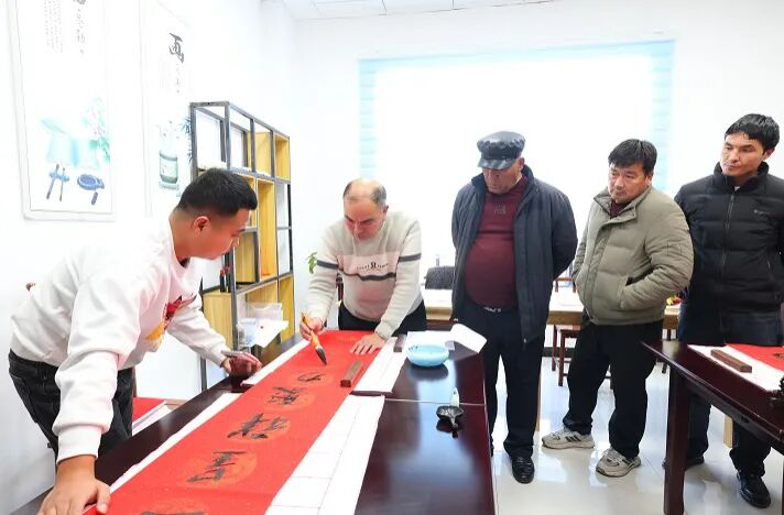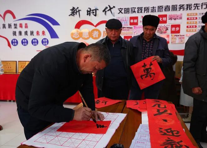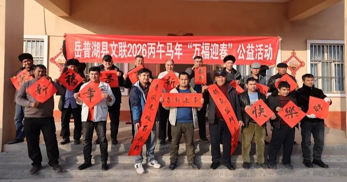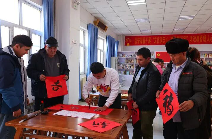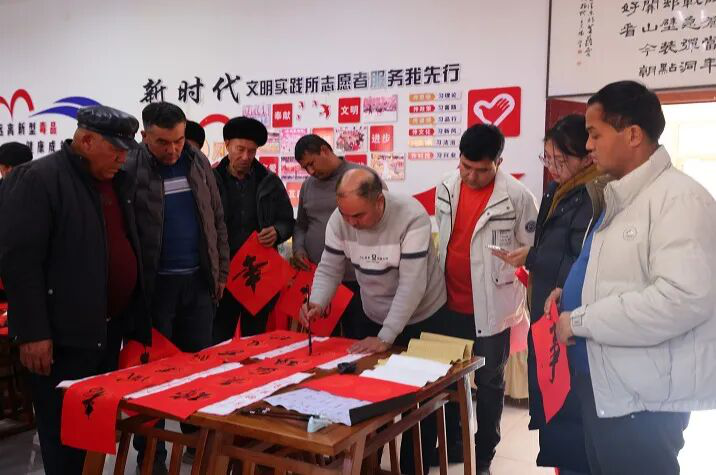 12月24日,县文联组织书法家协会成员走进岳普湖镇开发区社区,开展“万福迎春”公益活动,为即将到来的2026丙午马年送上新春祝福。