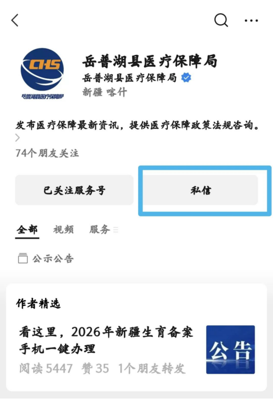操作步骤如下:第一步:打开微信,扫描下方公众号二维码或在搜索栏输入“岳普湖县医疗保障局”,关注官方公众号。