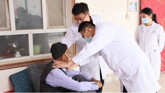 在色也克乡2村,一位70岁的食管癌术后患者因缺乏专业护理知识,出现营养管堵塞、体重下降的情况。赵广永蹲在老人炕边,一边耐心讲解营养管护理的注意事项,一边亲手示范如何冲管、如何调配营养液;得知村里有多位老人长期咳嗽却未就医,他逐一为老人们听诊、查看胸片,详细询问病史,对疑似慢性阻塞性肺疾病的患者,现场指导用药方法,并留下自己的联系方式,叮嘱他们有问题随时咨询。